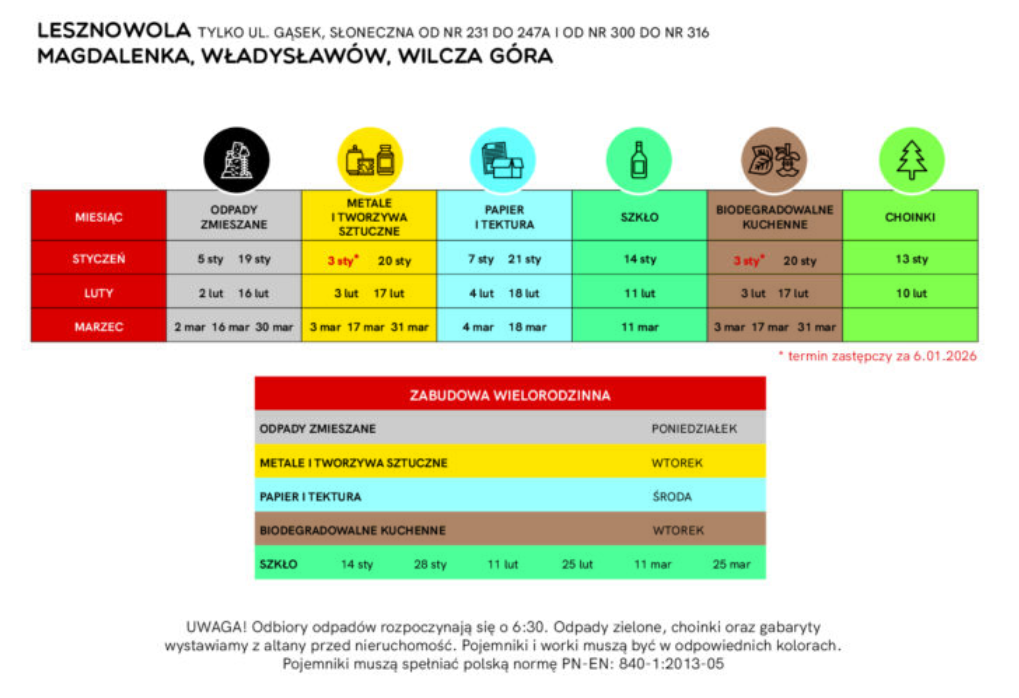 W związku z ustawowo wolną Wigilią, odpady komunalne (metal, plastik, papier) będą odebrane w dniu 19 grudnia (zabudowa jednorodzinna) oraz 23 grudnia (zabudowa wielorodzinna), zamiast 24 grudnia.
